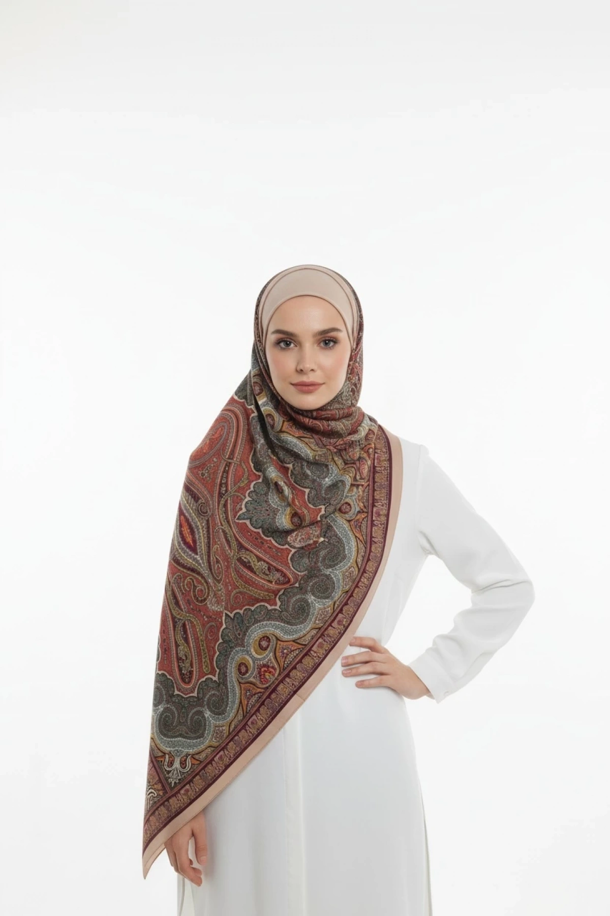 Kırmızı, altın, gri ve pembe tonların zarif geçişleriyle tasarlanan Arvena; paisley ve ornamental detaylarıyla her bakışta yeni bir hikâye fısıldar. Bahçede ya da şehirde, Arvena omuzlarınıza zarafeti bırakır. Hafif dokusu ve akışkan formu sayesinde gün boyu konfor sağlar.