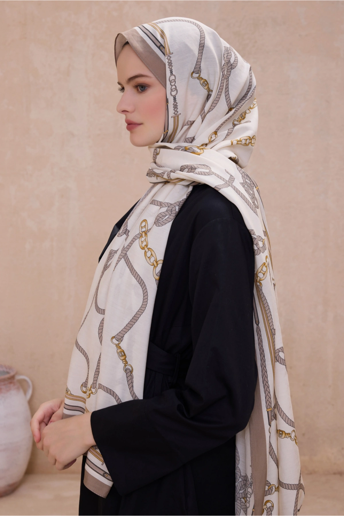 Klasik zincir ve halat motiflerini modern bir renk paletiyle yeniden yorumlayarak stilinize güçlü bir imza atıyor. Koleksiyonun her bir parçası, kontrast renklerin uyumuyla hem klasik hem de modern kombinlerinizi tamamlar. İster ofis şıklığında ister günlük hayatta; bu desenin zamansız enerjisi size her ortamda eşlik eder.