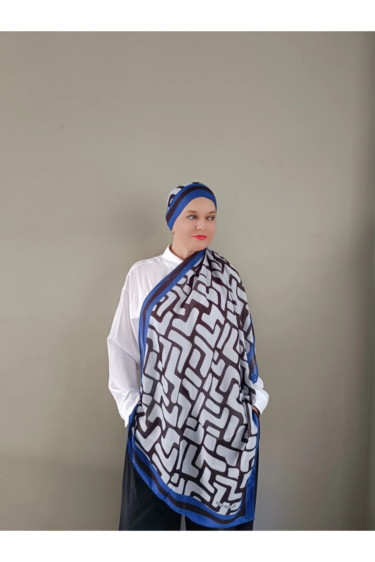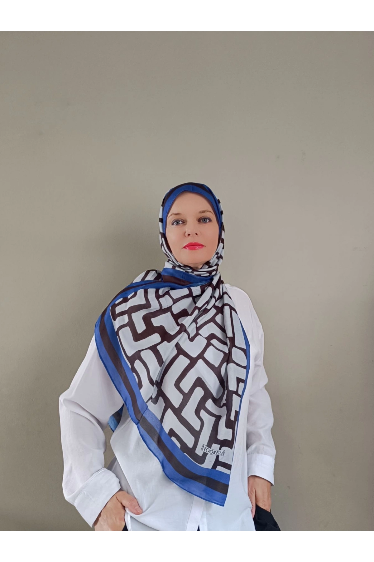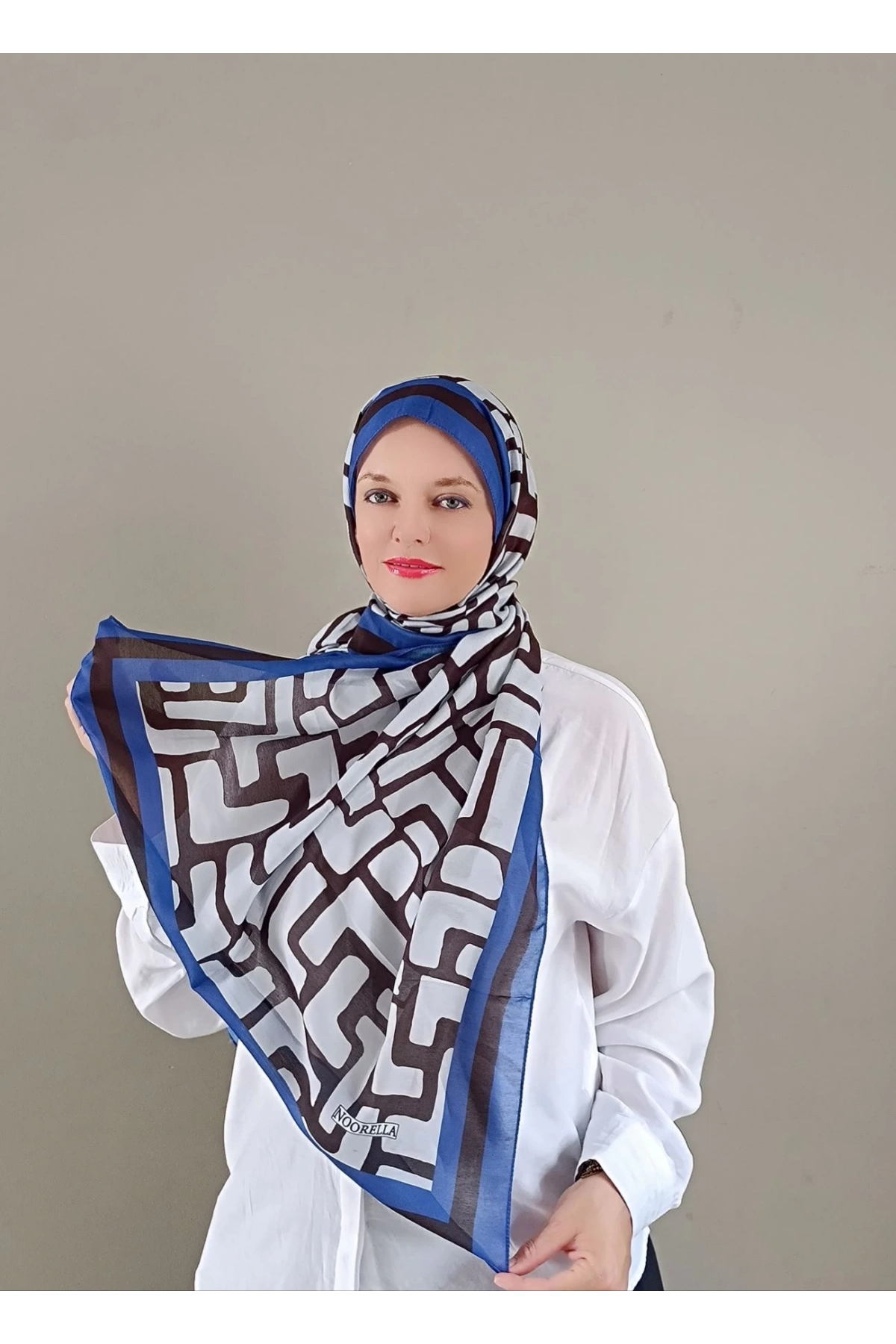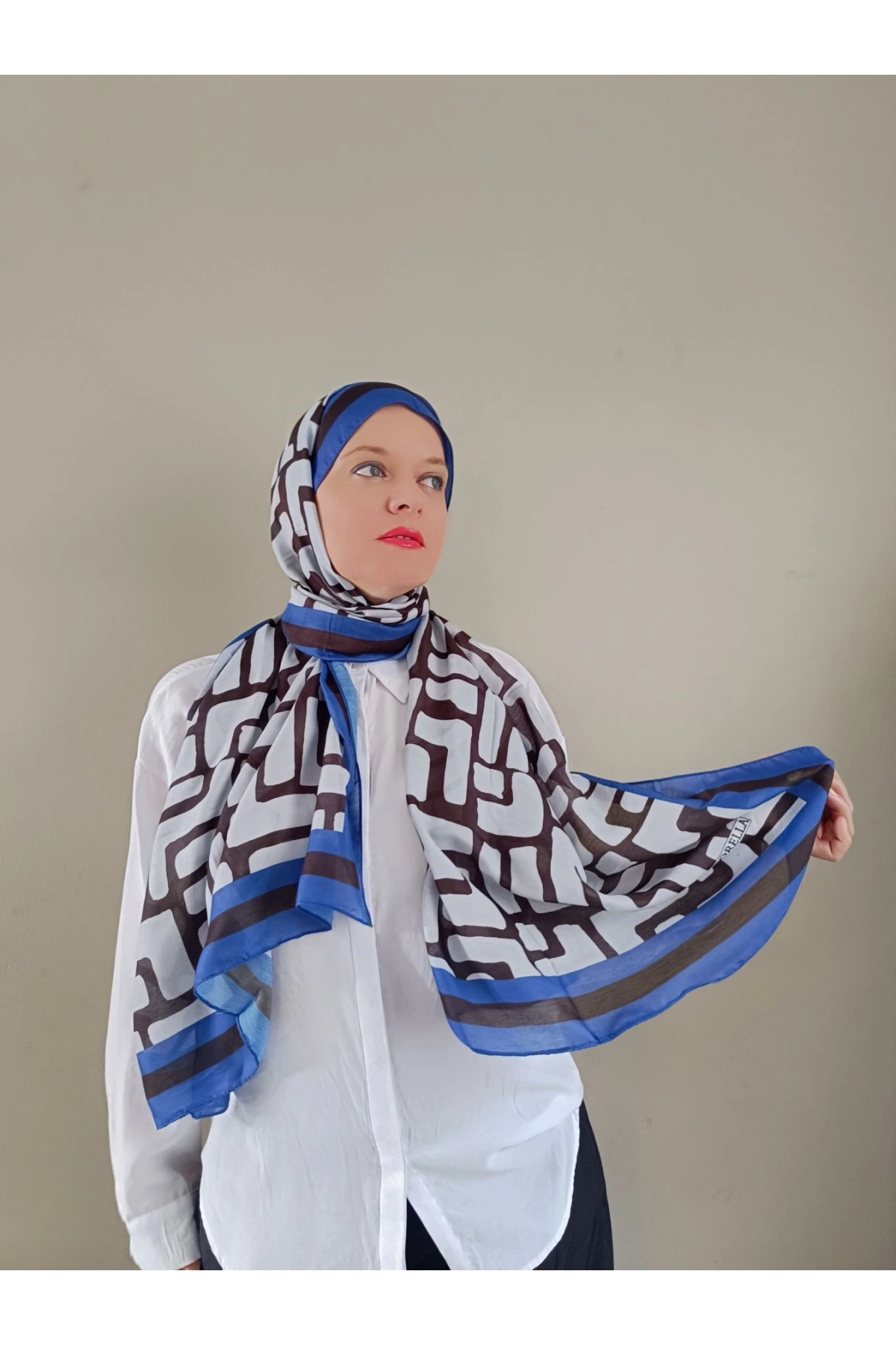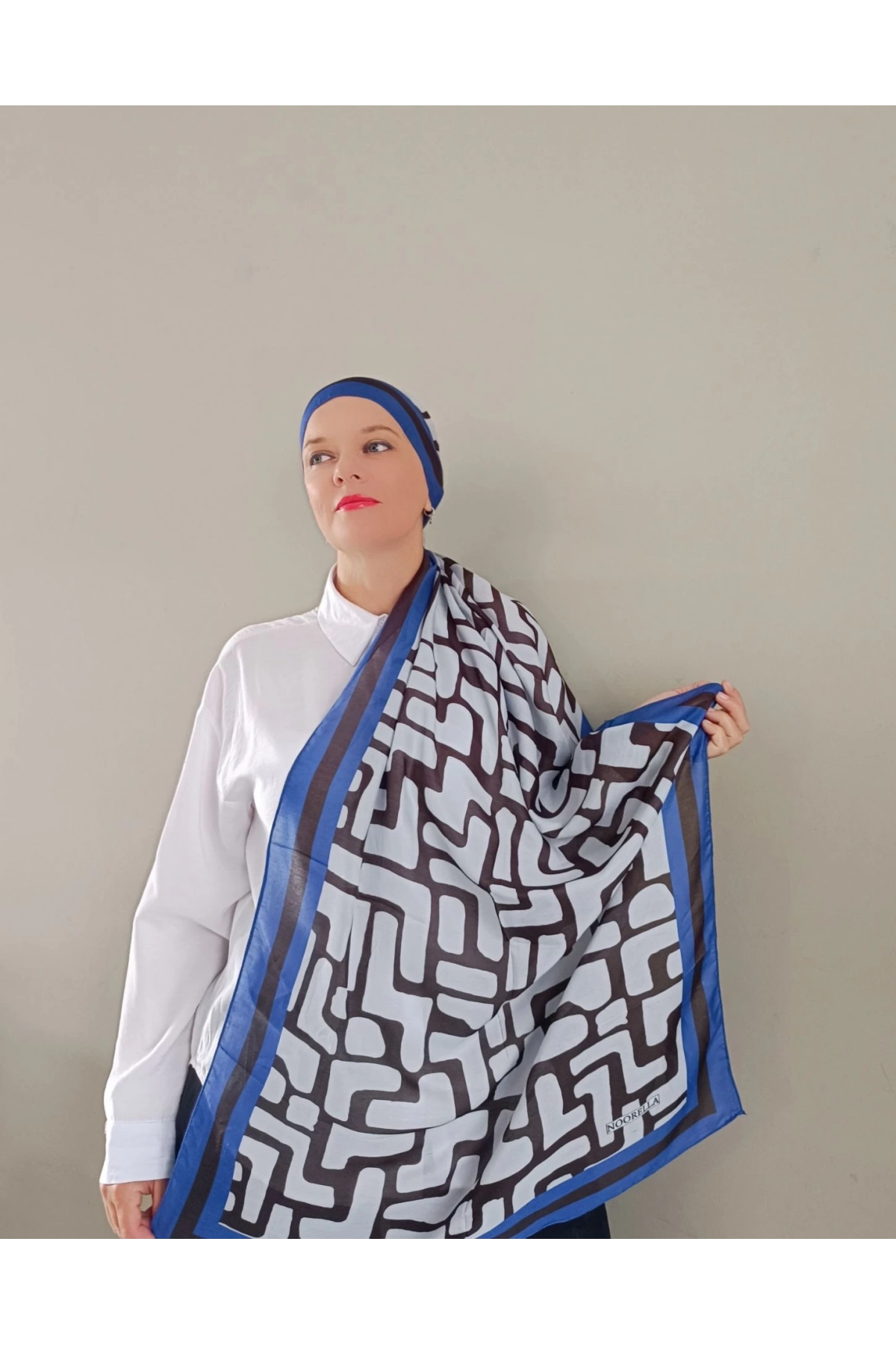 Mira, modern geometrik motifleriyle şehirli ve zamansız bir stil sunar. Beyaz-siyah desenlerin ritmik akışı, lacivert ve mavi kenarlarla dengelenir. Hafif dokusu ve akışkan formu sayesinde gün boyu konfor sağlar; her kıvrımında özgün bir ifade taşır. Hem sade kombinlere hareket katar hem de cesur stilleri tamamlar.