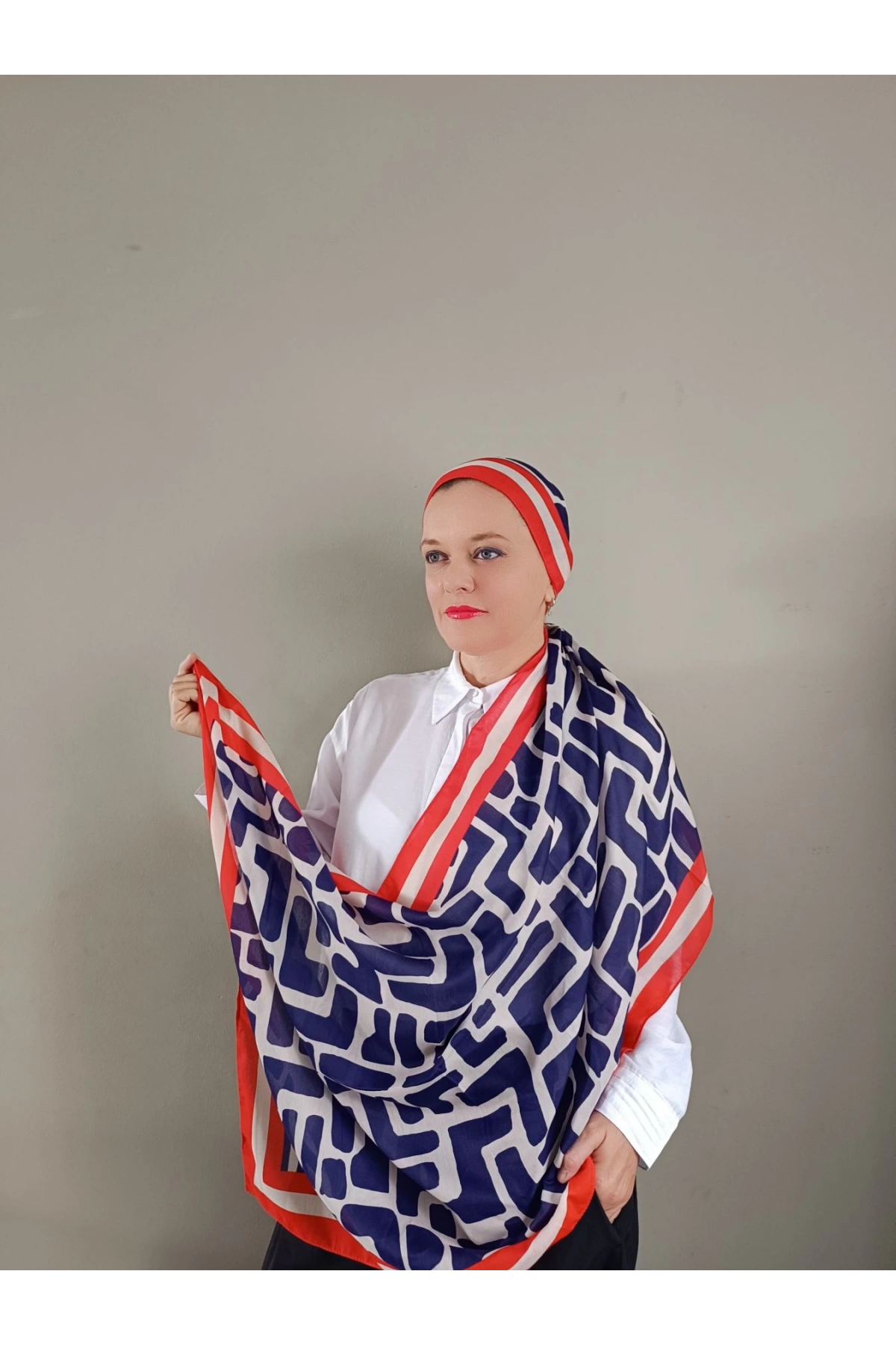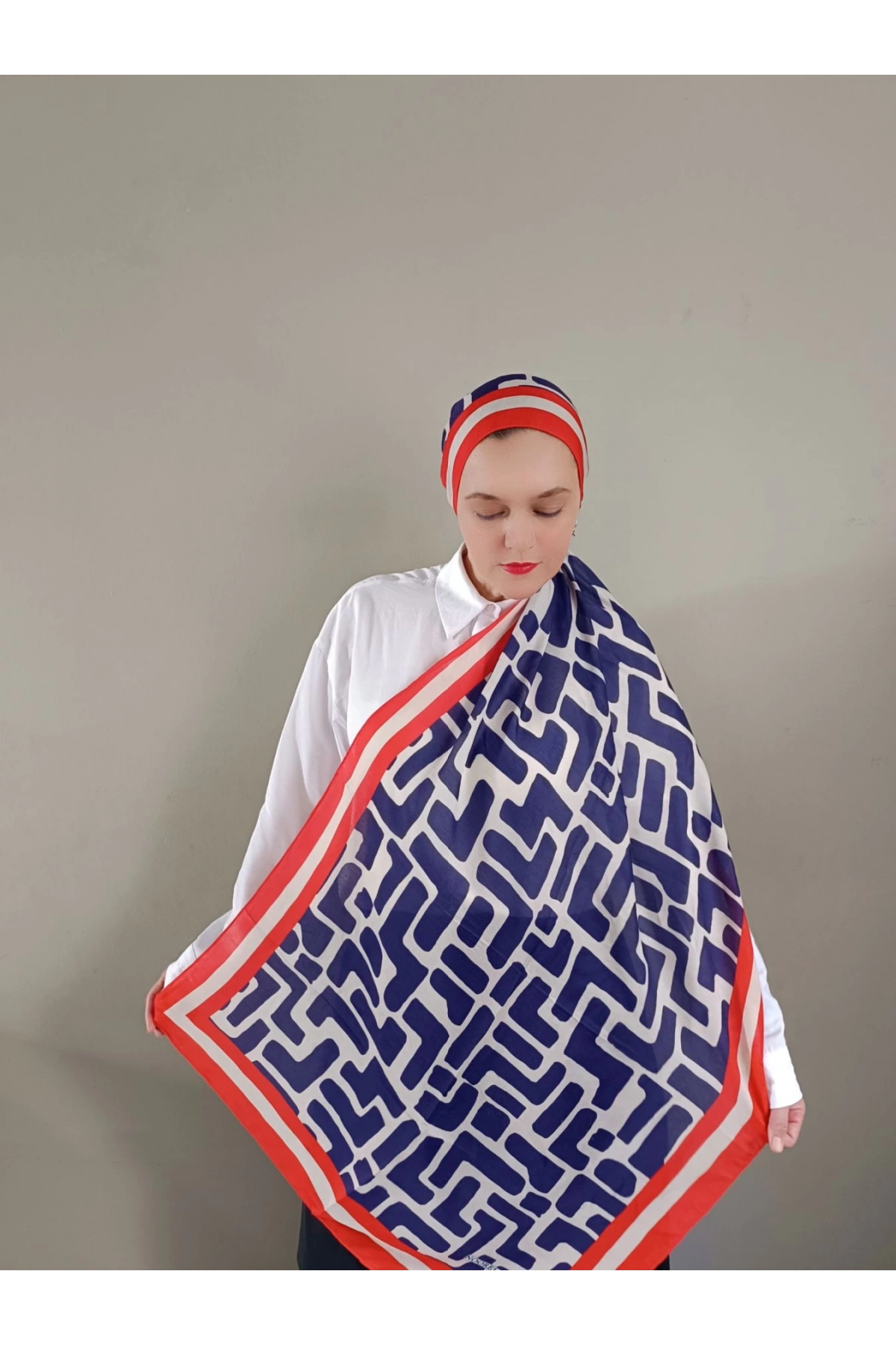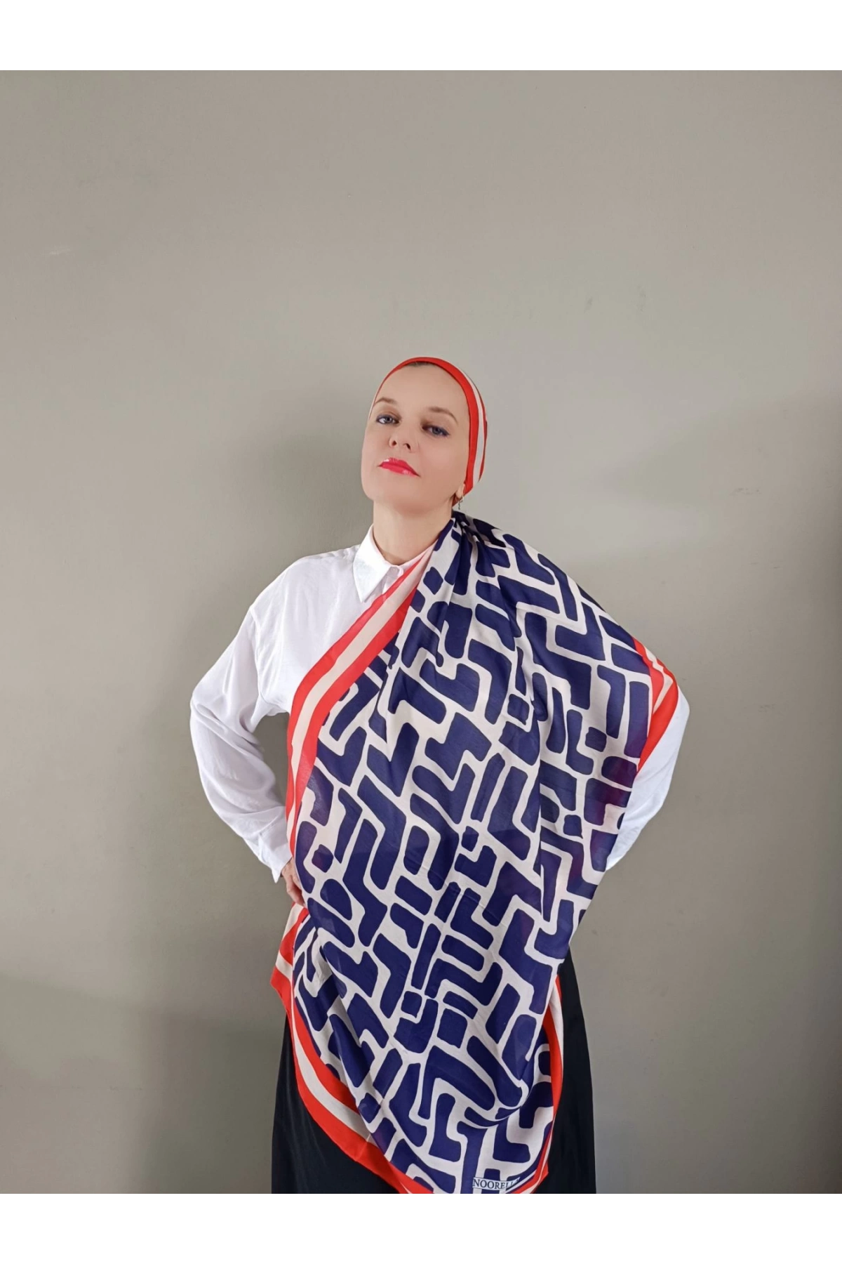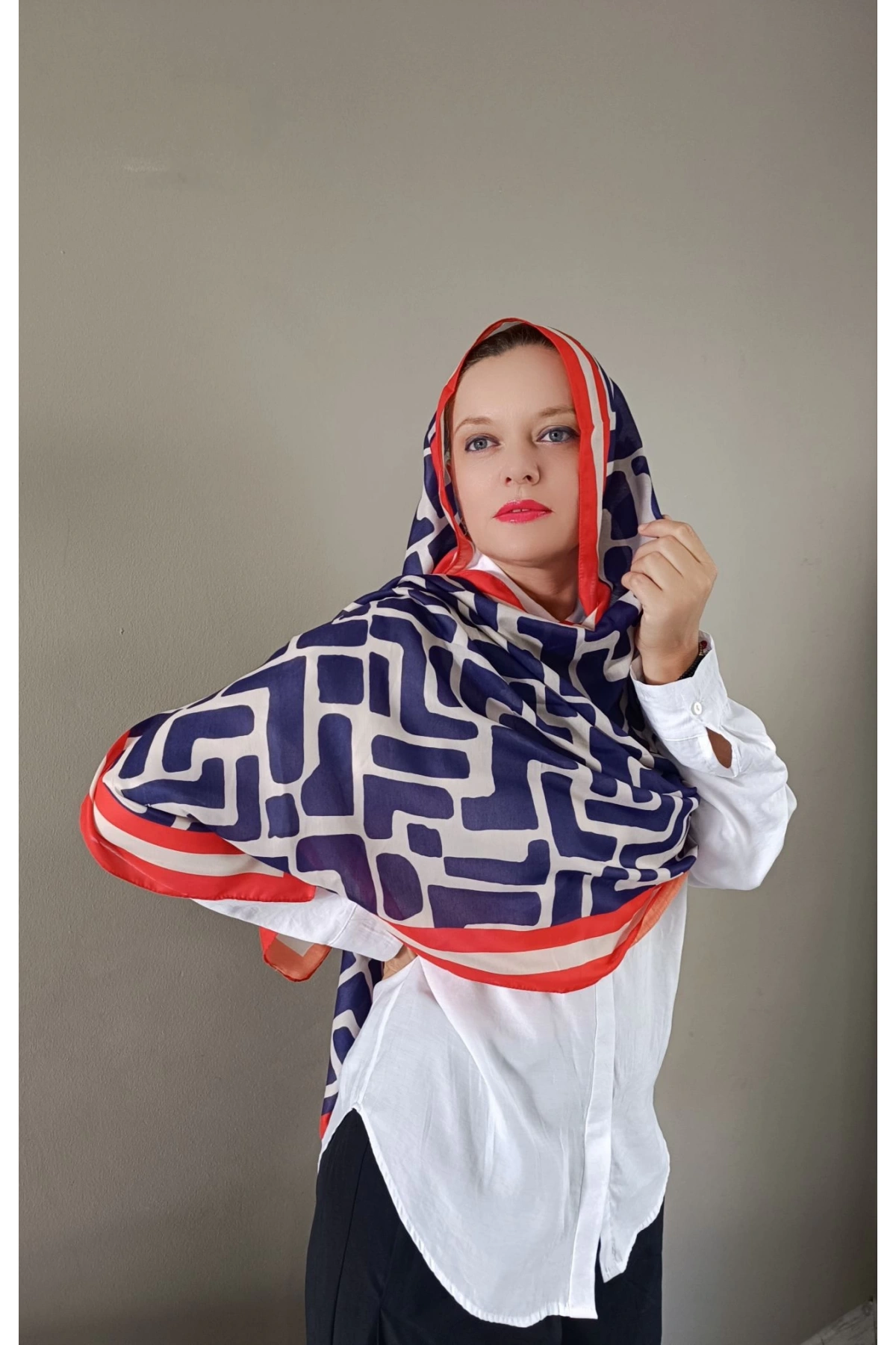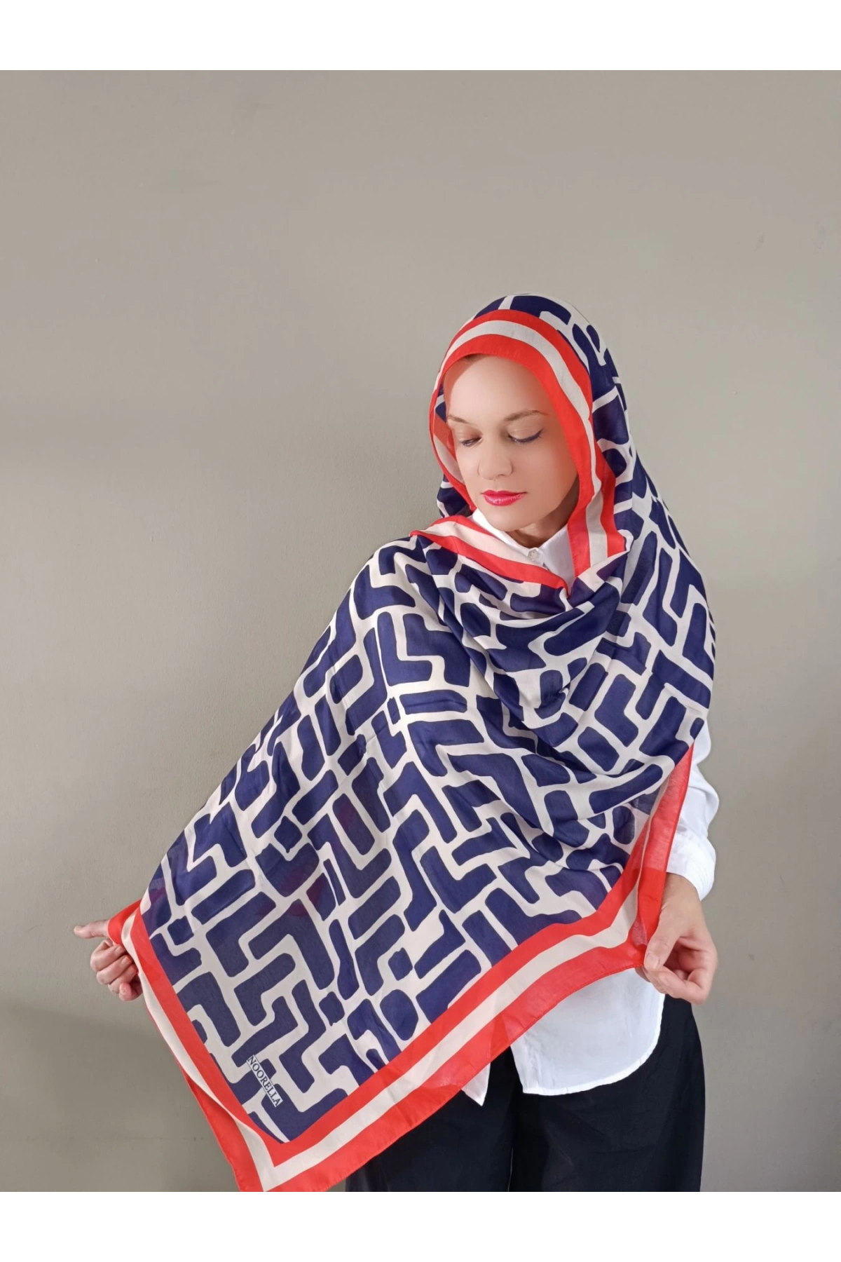 Mira, modern geometrik motifleriyle şehirli ve zamansız bir stil sunar. Beyaz-siyah desenlerin ritmik akışı, lacivert ve mavi kenarlarla dengelenir. Hafif dokusu ve akışkan formu sayesinde gün boyu konfor sağlar; her kıvrımında özgün bir ifade taşır. Hem sade kombinlere hareket katar hem de cesur stilleri tamamlar.