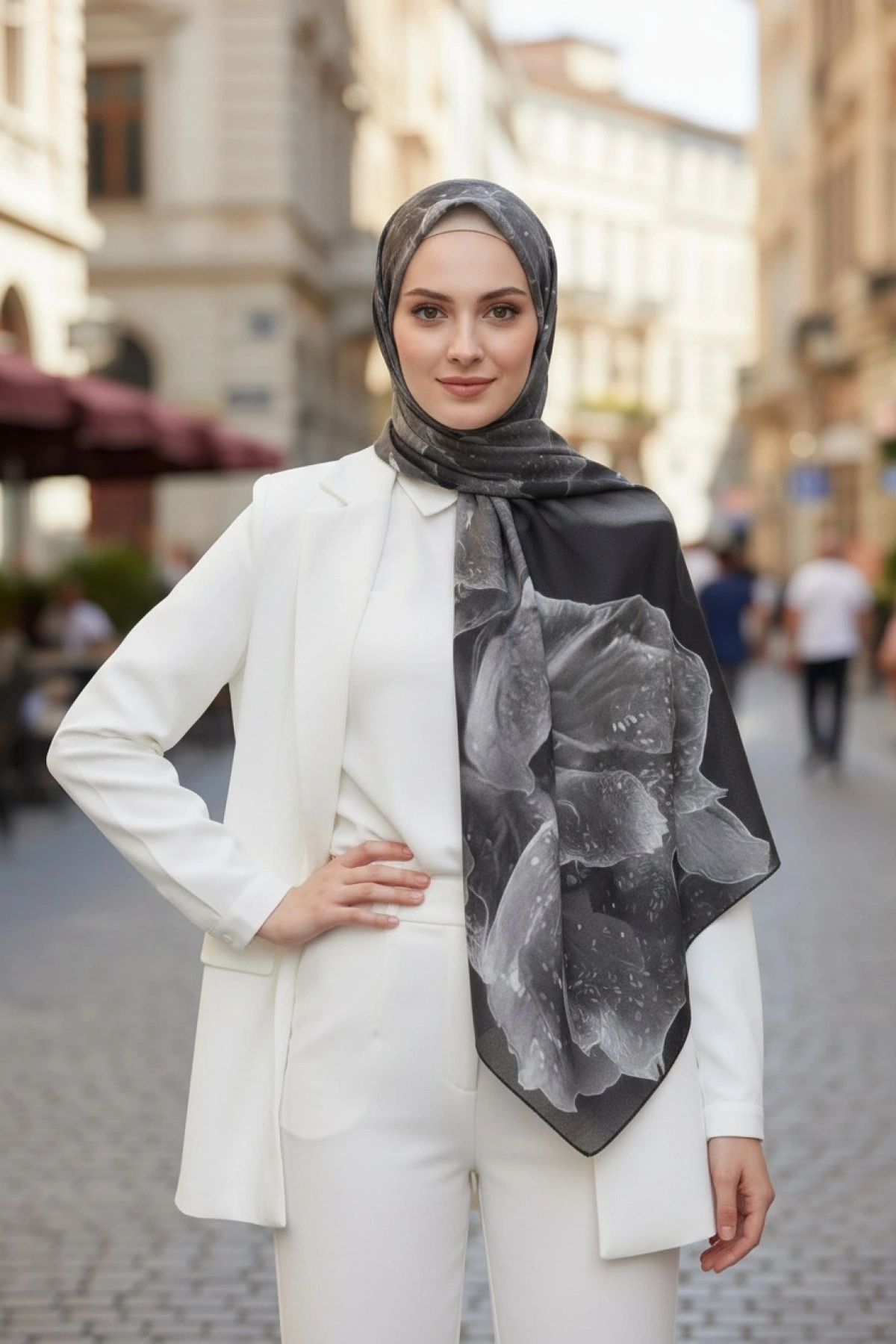 Mavi ve gri tonlarda büyük floral detaylarla tasarlanan Mireya; gerçekçi çiçek çizimleriyle hem şiirsel hem sofistike bir duruş sunar. Beyaz zeminle kontrast oluşturan bu desen, sade kombinlere güçlü bir dokunuş katar. Hafif dokusu ve akışkan yapısıyla gün boyu konfor sağlar.
