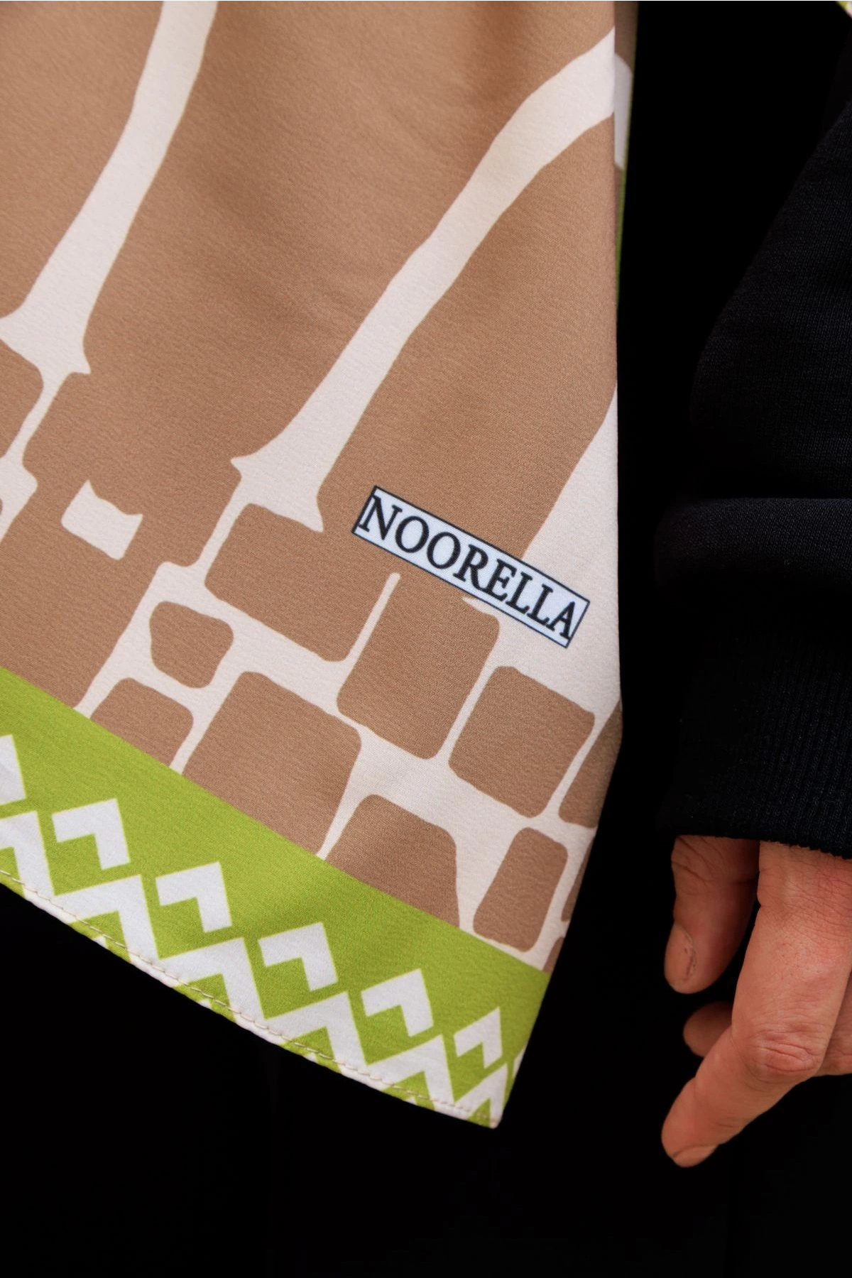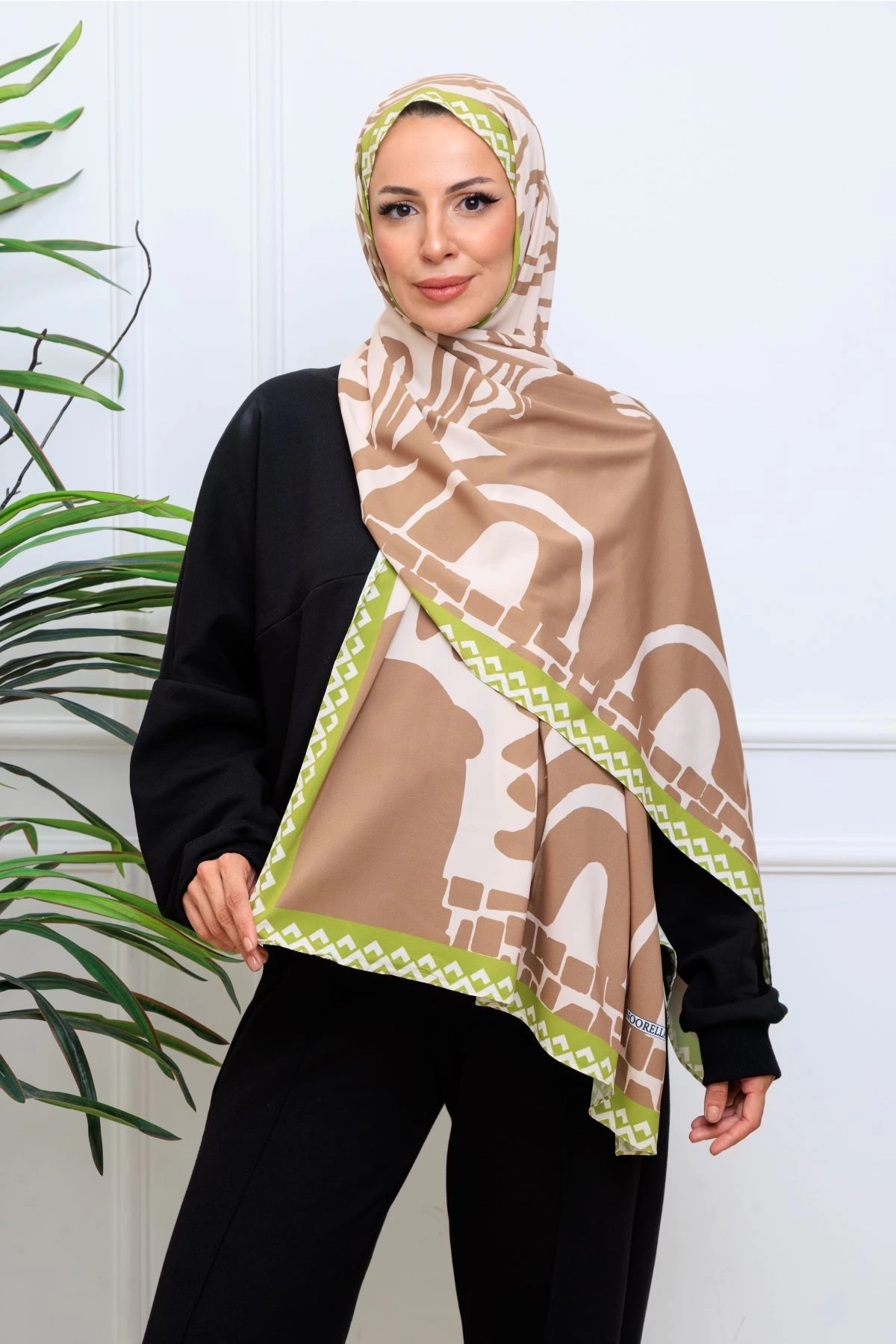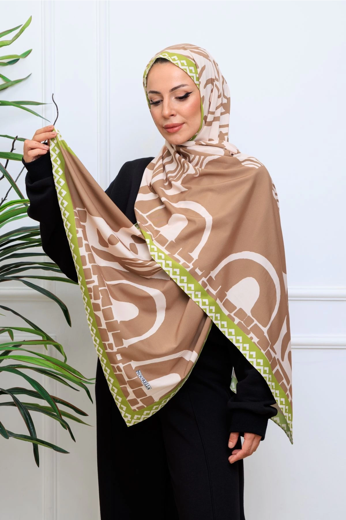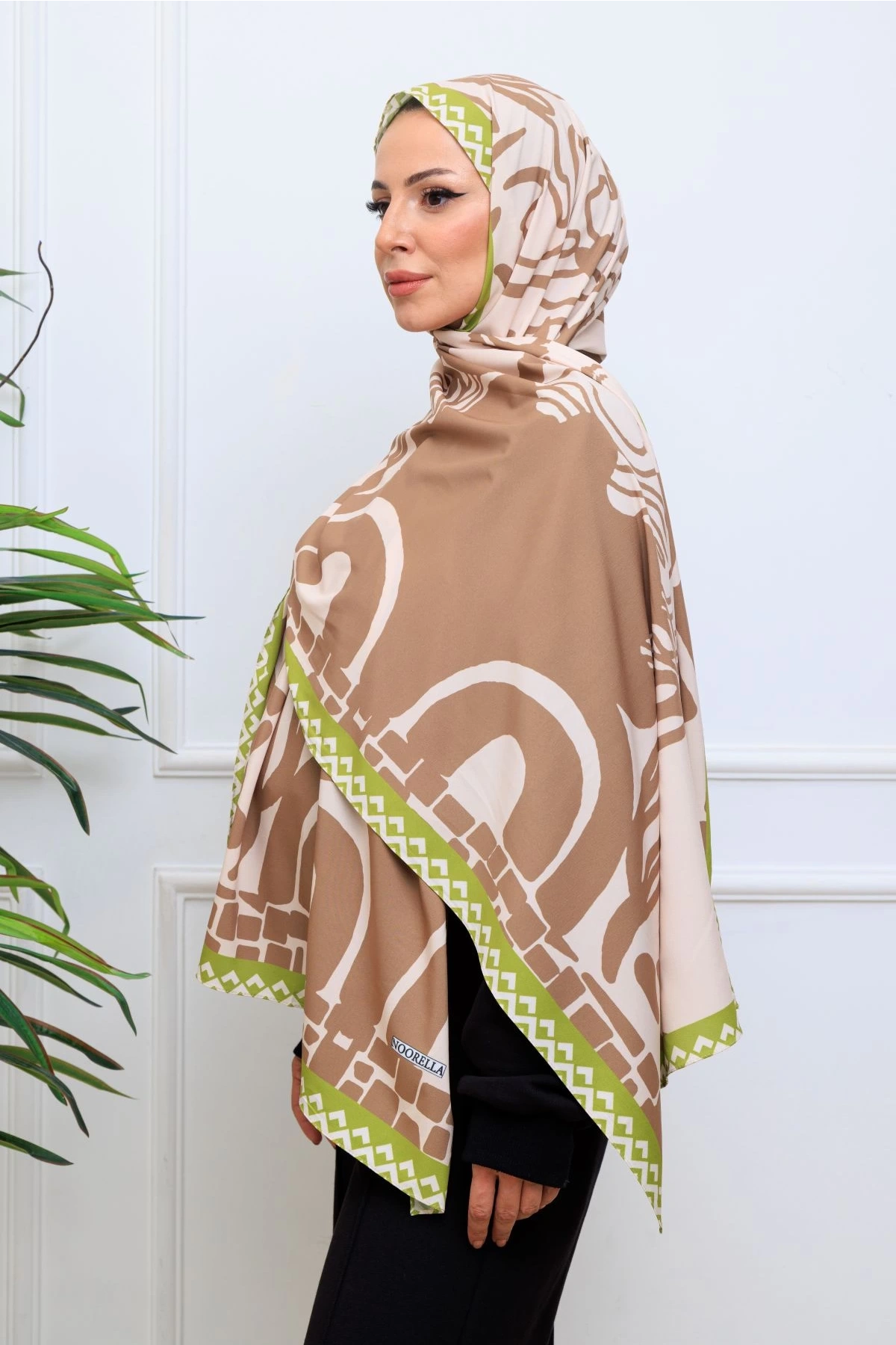 Bej, yeşil ve beyaz tonların dengeli geçişiyle tasarlanan Zerra, geometrik kenar çizgileri ve soyut motifleriyle modern bir görünüm sunar. Hafif dokusu ve akışkan formuyla hem şehirli stile hem doğal kombinlere eşlik eder.
